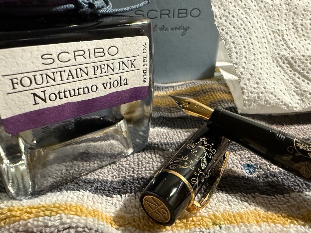 I think the time has come to work my way through some ink and I’m going to start with this massive bottle of deep, dark purple from Scribo. When I started to think about an ink to pair with the Onoto, this was high on the agenda. I originally popped in a cartridge of Herbin’s Bleu des Profondeurs because I was away from home and cartridges are so easy to travel with. The dark blue was just fine, but a bit boring, especially as I ended up with the same colour in every pen for a while. I used up the cartridge then cleaned the pen. Onoto supplied a converter so I also flushed that through, ready for some bottled ink. Fountain Pen Day rolled along on November 1st and this proved to be the ideal point to uncap the ink and get it inside the pen.