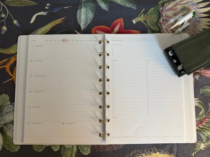 The insert choice is also pretty good. The first thing to decide is whether to go with a dated insert on 80gsm or 90gsm paper, or an undated version on 100gsm paper. I’ve used the 100gsm paper in the past and it is good with fountain pen ink, so I chose that. Once you’ve made your way to the undated pages, the main choice for the diary is vertical or horizontal week to view. The vertical week to view spans both pages and each day has space for appointments then a task area below. Saturday and Sunday share one column. Spaces are set aside for top 3 priorities, the week’s main goals and notes for next week. I opted for the horizontal layout which also has room for the same items, but groups them on the right-hand page whilst the left side is essentially a week-to-page diary. Once again, Saturday and Sunday share a space. There’s also a quote for each week and a “mood” tracker – I find these unnecessary but not intrusive. You get 12 months of diary pages and, if you go for the dated version, you can choose your start and end month (right now it’s got options right through to April 2026-March 2027). I really like that because it allows you to live by a non-standard year if you want to.