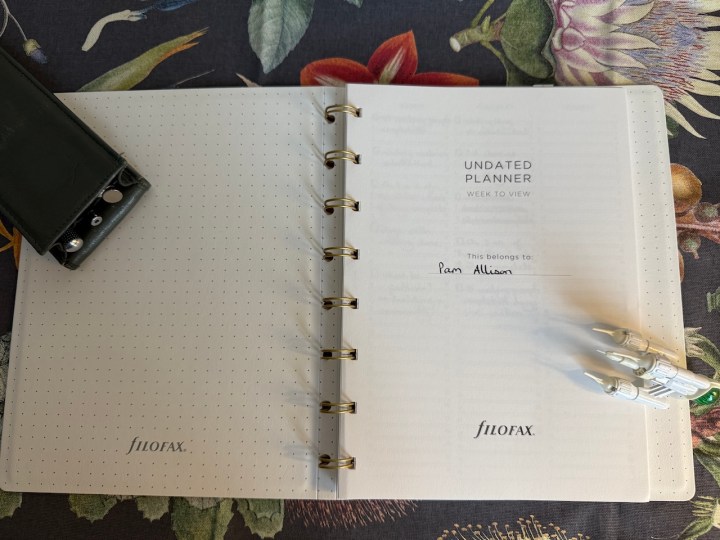Starting from the outside, let’s look at the cover, and let’s address materials because Filofax use different covers for different options. Some of their standard refillable notebooks, those that have lined, squared or dot grid pages but no diary, have laminated cardboard covers, others are plastic. The covers in the “Design your own planner” option are all plastic and, not only that, but they have quite a distinctive smell which may be a result of the personalisation process. That smell really is the only downside I can see to this planner so I wanted to get it out into the open right from the start. If you can ignore the aroma, you can choose from 125 designs at present count, and then you can have a personalised title added to any of the designs. The personalisation sits in a title block; you get some choice over the colours and sizes both of the block and up to three lines of the text. I think they’ve got this spot-on – there’s enough leeway for you to be creative, whilst ring-fencing enough to make sure the overall design remains consistent. I chose a spotty cover for my writing planner with simple text and I like how this has turned out. Inside, the cover is white with a dot-grid pattern and a simple “fILOFAX” logo. I hate that first lower case F but that’s the price we pay to be modern. This is a minimal cover, no pockets, no pen loops, nothing fancy whatsoever. That, of course, means it’s small, it’s lightweight and it’s portable.
