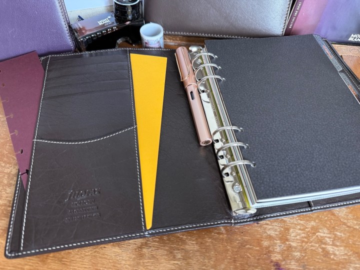 I can’t deny the only reason I’ve bought the A5 Holborn, and most particularly the brown version, is because my local department store, Jarrolds of Norwich, has decided it will no longer carry Filofax as a brand (boo!). This meant they had some impressive bargains, including half a dozen A5 Holborns, either brown or black, marked down by 70% – I defy anyone to resist that sort of pressure. The included diary pages date back to 2022, so this probably counts as “new old stock”. I hadn’t noticed them having more than a couple of any single binder design in their shop, so I wonder if these were hanging out at their warehouse, potentially to be brought out in September with next year’s diary added.