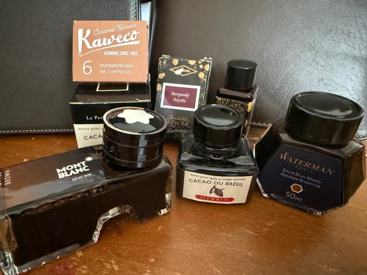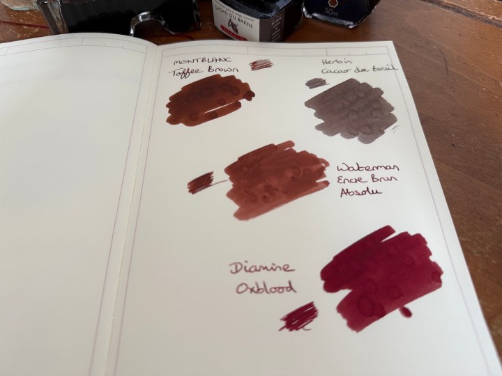The second brown item to enter my life recently is hiding in plain sight in my Filofax photos: a bottle of Montblanc’s Toffee Brown ink. This was a generous gift from a work colleague who had used a little of it but no longer wanted it. I have quite a bit of brown ink, but I don’t like to think of anything being abandoned and unloved. Actually, I’m surprised by how much brown ink I do have. Having collected it all together for a photo, I find it’s four bottles plus two sets of cartridges. Two of these – Diamine’s Oxblood and their Burgundy Royale – might not be everyone’s idea of brown but they edge in that direction to my eye. And Herbin’s Cacao du Bresil only just stays in the brown category as it wanders off towards grey. I think the Montblanc is closest to Waterman’s Absolute Brown, but they each have a place.