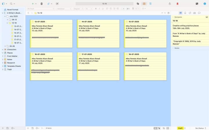 I’ve been trying out a variety of software to see which I prefer for my writing. Just basic word processing using Apple “Word”? Even more basic Apple “Notes”? Massively complicated “Scrivener”? Something different – say, “Ulysses” which would do double duty to draft my blog posts? Give up on it all and just hand-write them? Ultimately, I’ve defaulted back to Scrivener because, despite being more complex than I need it to be, it does have the best combination of views for my taste. I like being able to mark entries with tags that I can set up to reflect the status of a piece (you can see all the pieces from last week are yellow which means they are still at draft stage). I could, of course, do this in Pages, but I’m pretty sure the tags are universal within the Mac ecosystem and I only need tags such as ‘draft’ or ‘review’ for my creative writing.