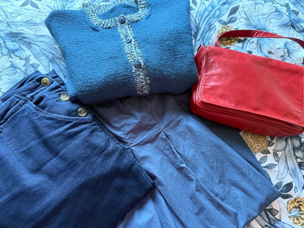 The cardigan looks comfy and a great colour. The red bag situation was a surprisingly easy fix!