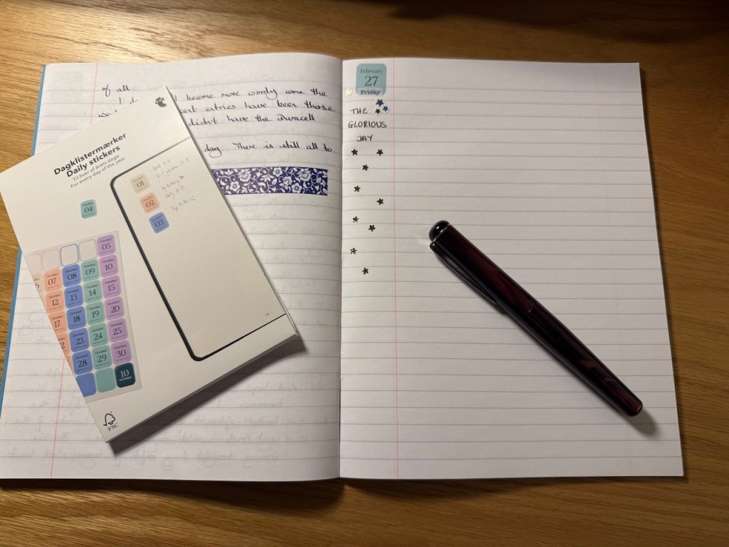 My morning journal notebooks have stayed the same and they have also changed. Silvine lined exercise books remain my go-to. Cheap, cheerful, and paper that copes admirably with inks. Can’t fault them. Now, though, I am using some date stickers I found at Flying Tiger together with day stickers I’ve collected from various places. The date stickers are printed on a thin, washi-style paper so they don’t bulk the notebook out too much. I’m now two months into this way of dating my entries and I can happily say I haven’t got many stickers on straight. It doesn’t matter, I think it’s charming, and I won’t hear anything to the contrary.