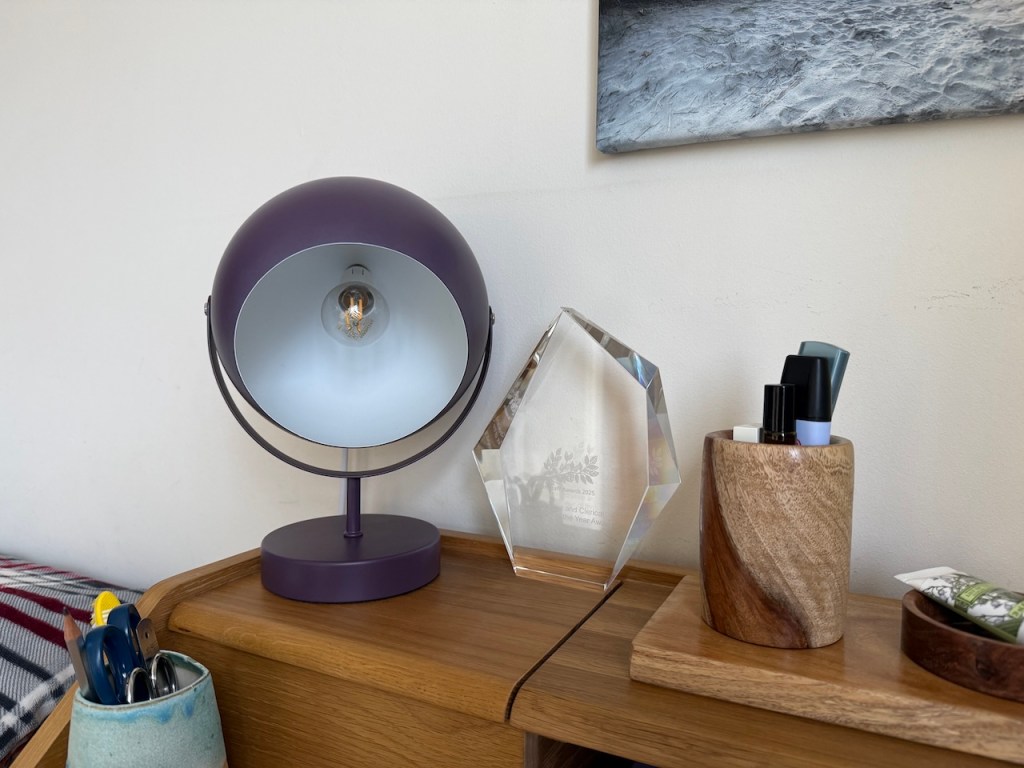 One significant change has been finding the perfect lighting. I had tried various lamps from around my flat, but none of them were exactly right. Mostly, it has to be said, too tall or too wide. A trip to the Futon Company to find storage for bedding and handbags unexpectedly netted me the perfect lamp. It fitted the purple theme I’d already adopted; it was shorter than other lamps I’d looked at; it would easily adjust to provide some light for my settee if I wanted it at any point. Perfect. Sold. As with anything that’s right, it fitted in immediately and feels like it has always been there. Funnily enough, I’d looked at these whilst browsing online and would never have purchased – sometimes you just have to see something in the flesh to be sold on it.