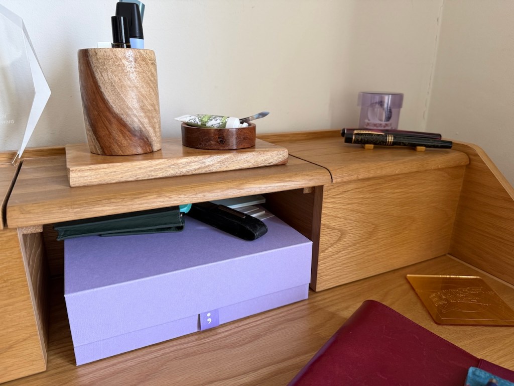 As well as the decorative items, there have been a few changes around the practical accessories on my desk. I’ve tried three different diary inserts in my personal Filofax since the end of 2025, but my fountain pen inks are being sniffy about all of them. In desperation I’ve resurrected the William Hannah to be my everyday planner. It’s not as portable as the personal Filofax, and I still prefer rings over discs, but the paper quality is undeniable. Now that I finally have some free time, I’m going to see if I can find some variety of printable insert that pleases me so that I can go back to the Filofaxes.