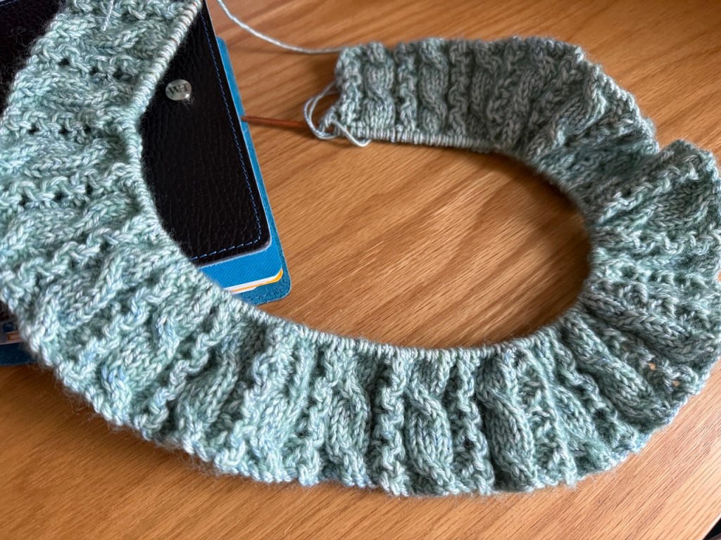 One item that was relatively easy to decide upon, and to get started, was a second “Swale” cardigan by Martin Storey. This is the pattern I used for my Big Blue Slouch and I’m knitting a version of it for my sister. Whilst I work almost exclusively in wool, her preference is for cotton knitwear, so I took my time to find a combination that would be nice for me to knit and for her to wear. I’ve settled on a combination of Scheepjes’ “Stone Washed” yarn – a blend of 78% cotton and 22% acrylic in the colour Larimar – held together with Fyberspates’ “Gleem Lace” – another blend, this time 55% Bluefaced Leicester and 45% silk in the colour Shoreline. The cotton is a light DK weight and the strand of laceweight provides the extra bit of bulk needed to get the right gauge for the pattern. Held together, these are making a very soft fabric which should be really lovely to wear and, despite the high cotton content, is actually pleasant to knit. I’m working on the welt which is this easy-to-remember combination of cables and lace, but soon I’ll be whizzing along through acres and acres of plain stocking stitch.