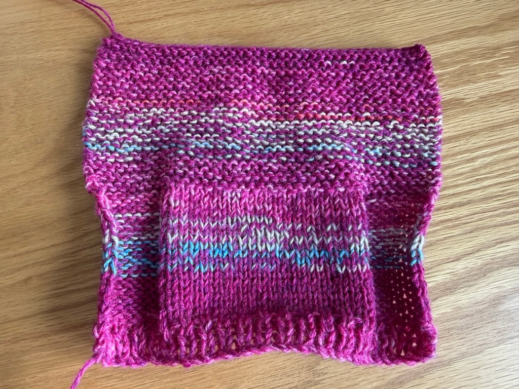 My final firm plan for the year is a slouchy, casual jumper in a jazzy combination of yarns just for kicking around at home or as a warm layer on swim days come the autumn. This idea was prompted by my sister turfing out some yarns from her stash including some balls of a vibrant sock yarn. I wouldn’t want a whole garment from just that, but held double with a strand of magenta coned wool and, I think, using garter stitch (as in the upper section of my swatch) this would make a jolly garment.