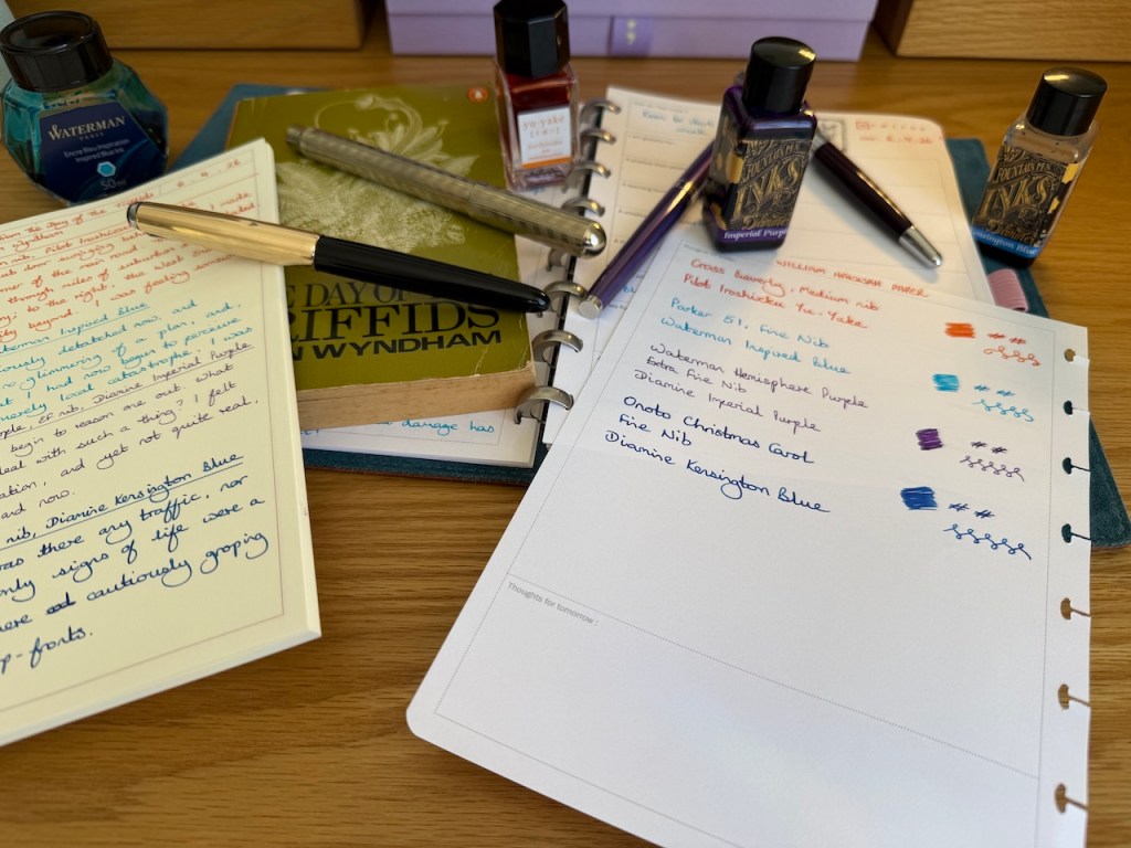 I have a few thoughts about inks I want to get into rotation. I’m definitely feeling the pull towards a softer grey, particularly with one of my wetter nibs. The candidates here are Pilot Iroshizuku Fuyu Syogun and Herbin Cacao du Brésil. The Herbin ink sits between a brown and a grey whilst the Iroshizuku is more of a pencil-lead shade. I love the combination of grey and purple, so it’s highly likely I’ll revert to Scribo Notturno Viola in one pen next month. That said, I have recently been feeling the pull towards a basic deep blue like Montblanc’s Midnight Blue… food for thought. I also fancy something a little softer for my contrast colour – possibly some kind of mild grey-green – a sector where my current ink collection falls short. I feel there may be scope for some experimentation/exploration over the coming weeks.