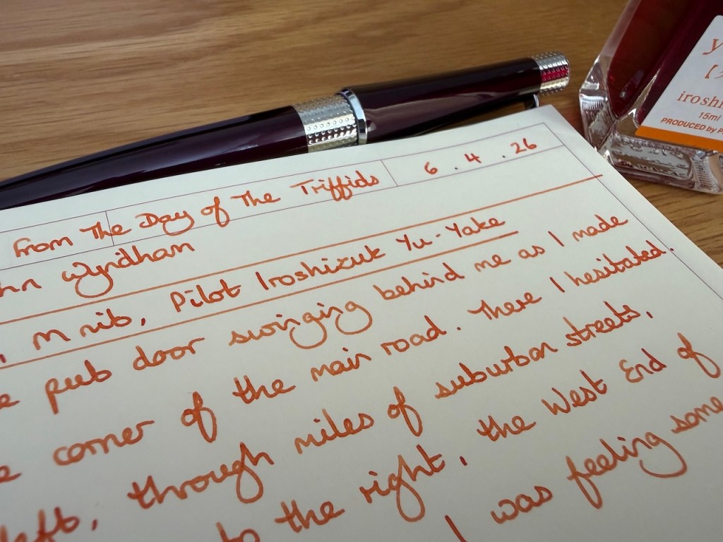 This should be an easy win so I’m going to focus on getting it out of rotation first. Whilst I’ve been leaning towards using this tangerine ink to write headings, I’m equally happy to use it for longer form writing. For example, I was recently away for a few days and used it to complete a couple of creative writing exercises. With the medium nib on the Cross Beverly laying down a reasonable amount of ink, I should be within two or three pages of writing this one dry so I’ll try to pick it up when I want to jot notes or to highlight particular thoughts.