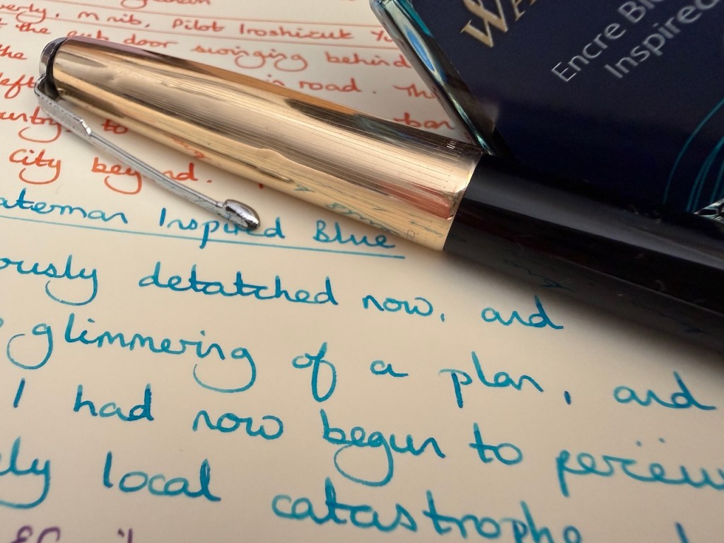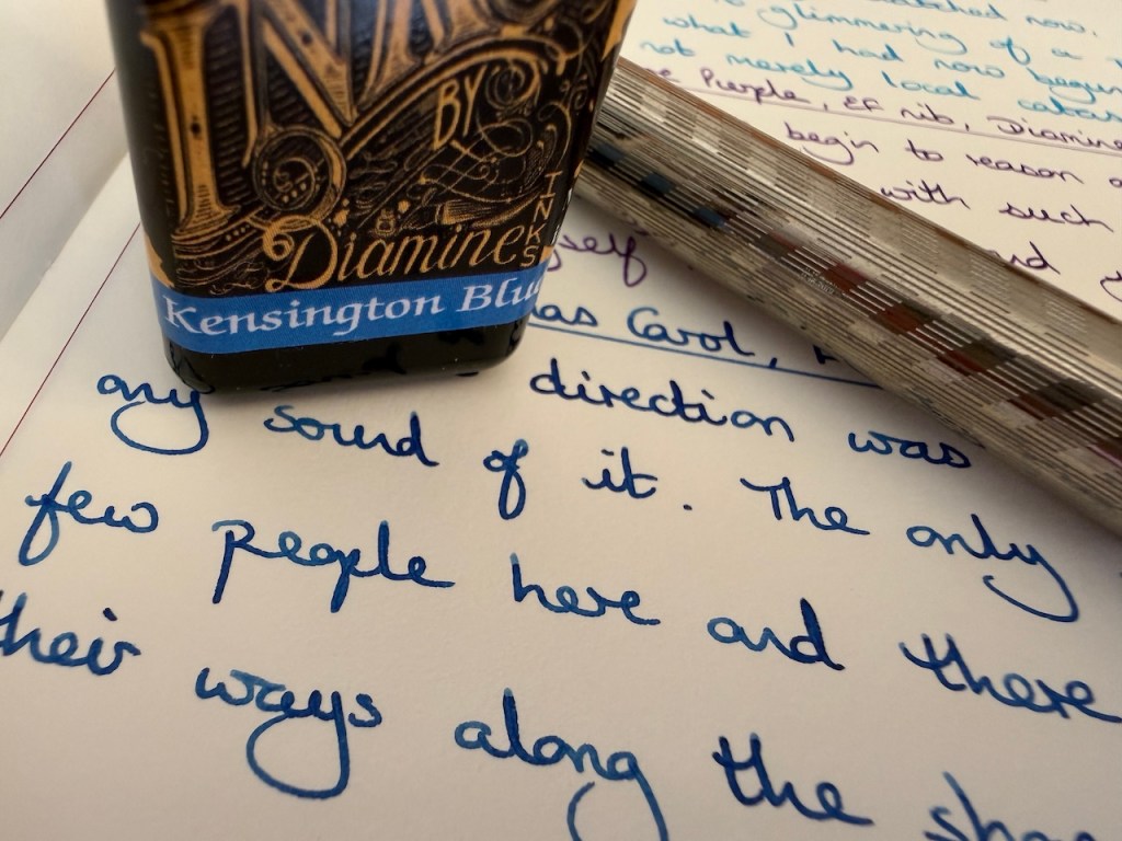 As soon as the Parker 51 and Cross Beverly are empty, this will step in as my main journal-writing pen. It, too, has a fine nib, but the ink flow is generous and I estimate what I’ve got will probably work for a week writing a couple of pages a day. There’s a lot to recommend with this blue ink: it’s strong, but still a mid-blue shade; a bit more interesting than your run-of-the-mill royal blues whilst being brighter than blue-blacks.