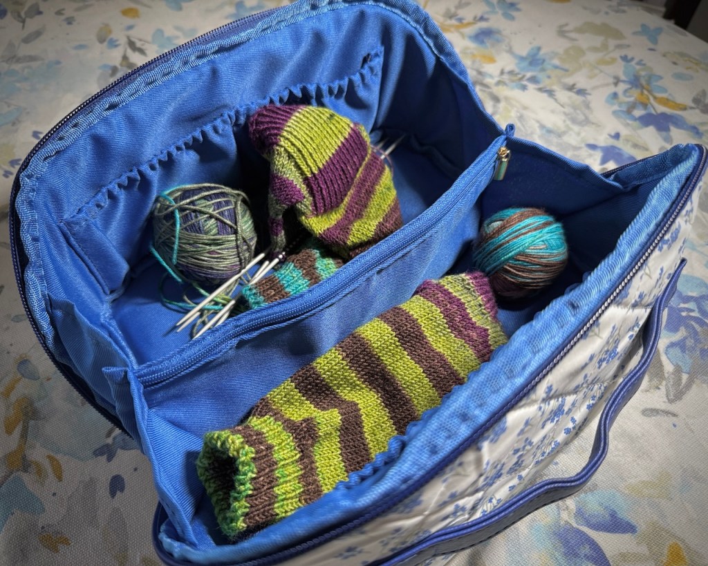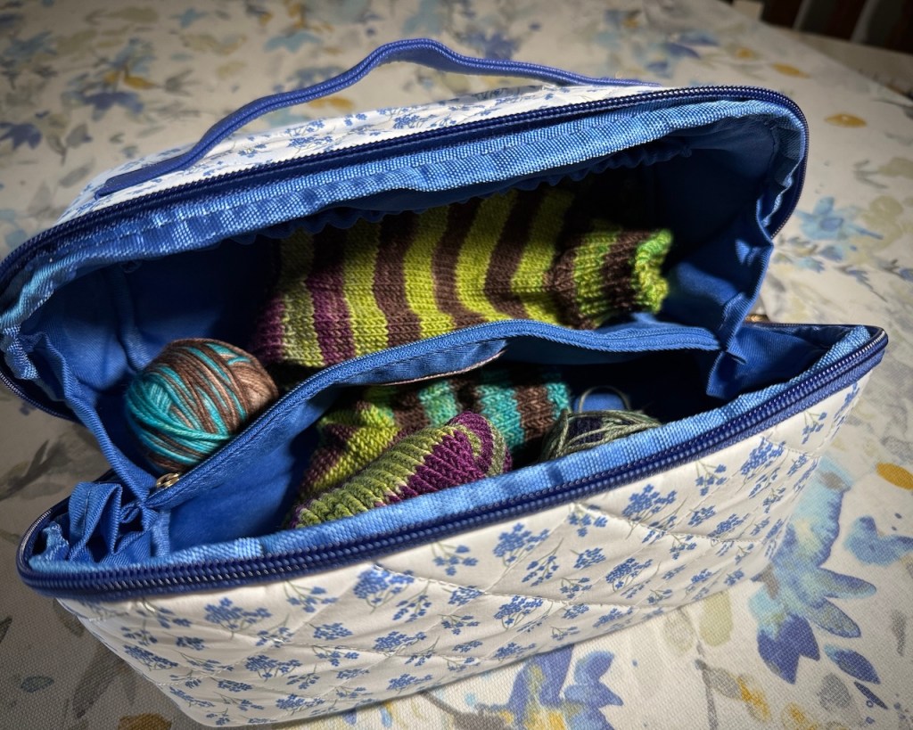 To compensate myself for the slightly less splendid sock yarn experience, I decided to upgrade my small project/sock knitting bag. I picked up this toiletry bag from TK Maxx because I’ve seen some similar versions being used as knitting bags (some actually designed for the purpose) and I’ve found them very appealing. The stand-out features are the internal pockets and the way you can unzip it to stand nice and open when you’re working. I had future travel plans in mind, too, when choosing this – it will be perfect to take a sock project with me on upcoming jaunts.
