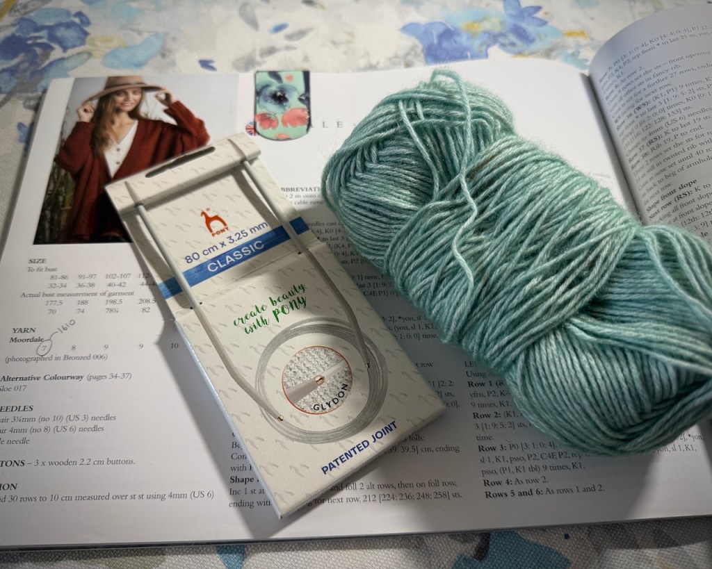 I wanted to touch on the needles I’m using as they, too, are a new purchase and I’m very pleased with them. As I have frequently mentioned, I don’t like using circular needles. I don’t think they support the weight of the fabric you’re creating as well as straight needles do, and I find that makes the knitting harder on the hands and wrists. With the size of this garment, though, even when it’s knitted to the correct size, they are essential. You just can’t cram that many stitches onto straight needles. My interchangeable needles were not making me happy as they were coming loose where you screw the tips onto the cable. I think I’ve just lost the knack of tightening the joint enough, but it was making me want needles where the cord is already joined. I did some research and Pony’s new “Glydon” joint to provide a smooth transition between the tip and the plastic cord seemed worth investigating. I can report that these seem to be very well-made and I haven’t been experiencing any snagging as I move the stitches along the needles. Top marks so far. Just need to see how durable they prove to be.