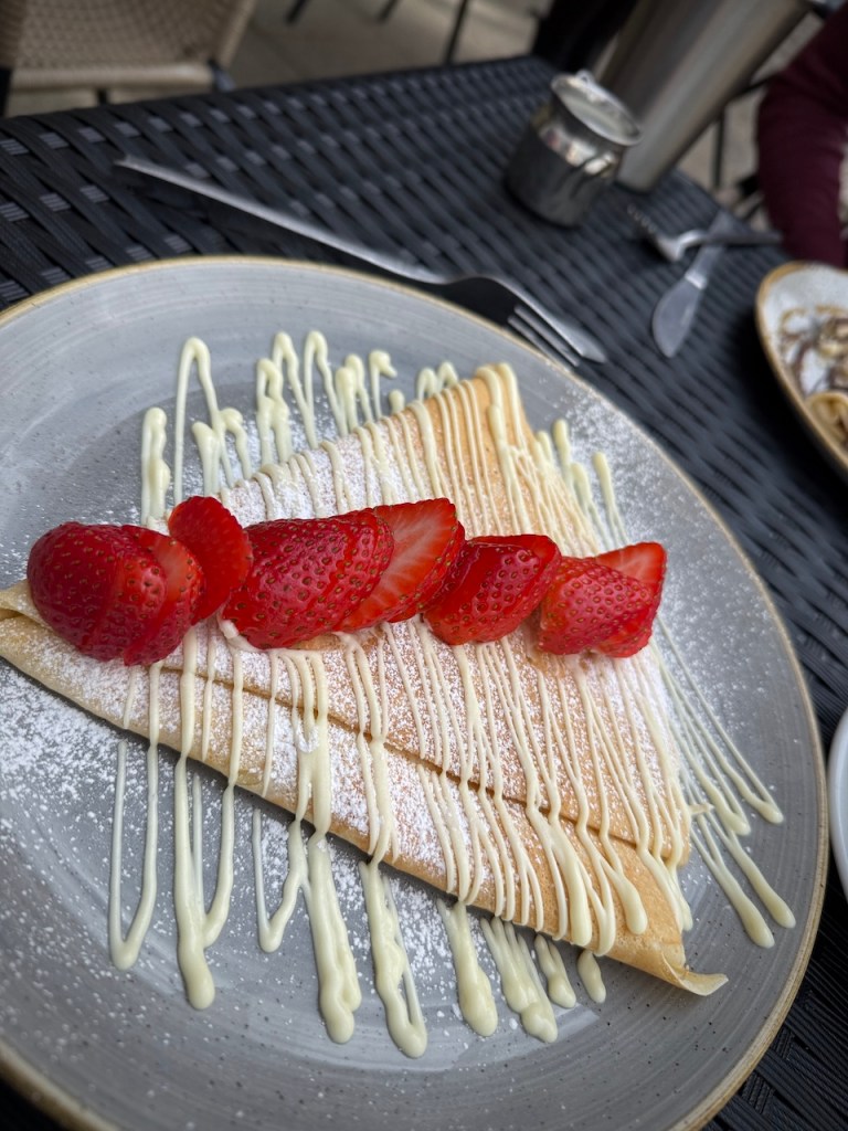 I’m ashamed to say that the very next day I treated my grandson to pancakes at Christophe’s Crêpes, another local institution originally operating from a van near the marketplace but now based in a small cafe opposite my local yarn shop and just through the archway in my top photo. At least I kept the French theme going! I chose the delicious white chocolate and strawberry crêpe, filled with melted white chocolate and marshmallow and topped with fresh strawberry. Oh goodness me, it was enjoyable. I hope the walk home at least burned one or two of the calories consumed.