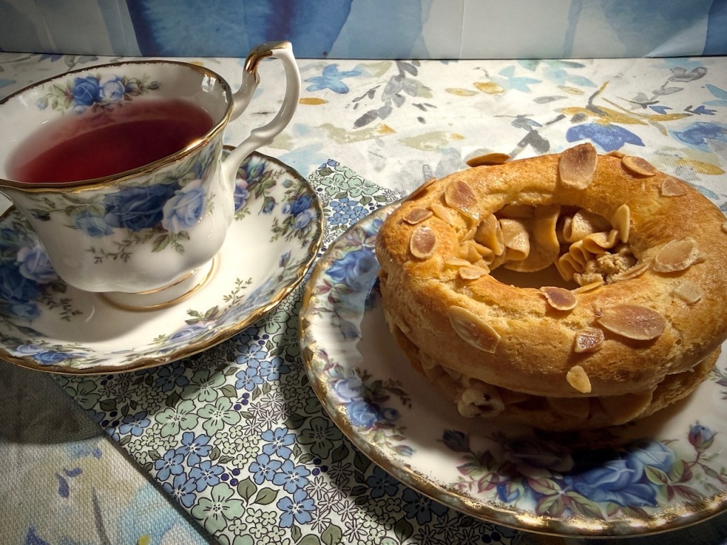My attempts to drop a little weight and, more importantly, lower my cholesterol levels are being sabotaged by the delicious treats around my home city this spring. It started when I dropped into Macarons and More on the corner of the very pretty Arcade (another must-see if you ever visit Norwich). They do thoroughly delicious French-style macarons, but on this visit I thought I was going to treat myself to a cake bar. Then I walked in and they had Paris-Brest on their counter. This is one of my all-time favourite confections: choux pastry filled with hazelnut praline cream and sprinkled with toasted almond flakes. I brought this home and ate it accompanied by a cup of Twining’s Blood Orange Tea (actually a fruit “tea” – what I would classify as a tisane). I can confirm that this cake was simply divine.